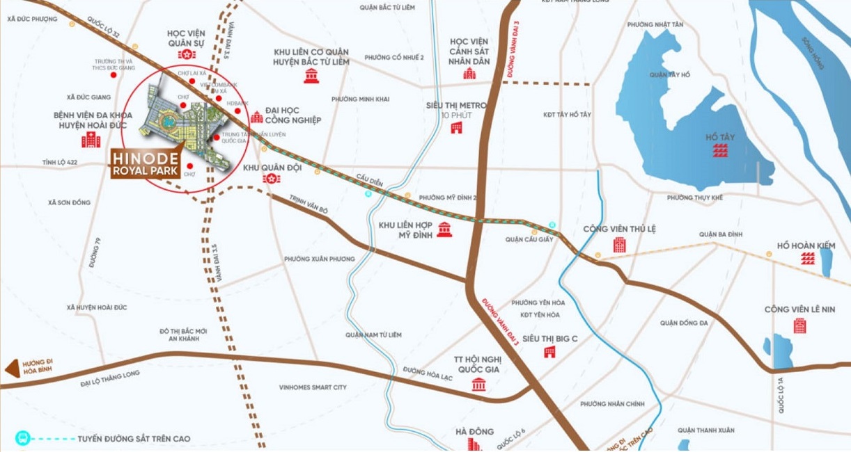 Khu đô thị Hinode Royal Park nằm trên mặt đường Vành Đai 3 và đường 32 đây là khu vực được mệnh danh là điểm giao lưu của thành phố Hà Nội, kết nối thuận tiện di chuyển về phía Bắc đường Phạm Văn Đồng rộng 93m, mở rộng 12 làn xe hỗn hợp, mỗi làn rộng 3,5 m, hướng về phía Đông Đại Lộ Thăng Long và phía Tây Láng Hòa Lạc, dẫn ra khu vực phía Nam thành phố Hà Nội. Từ đây, cư dân Biệt thự Hinode Hoài Đức chỉ cần di chuyển 4000m các trường đại học ở Xuân Thủy – Cầu Giấy