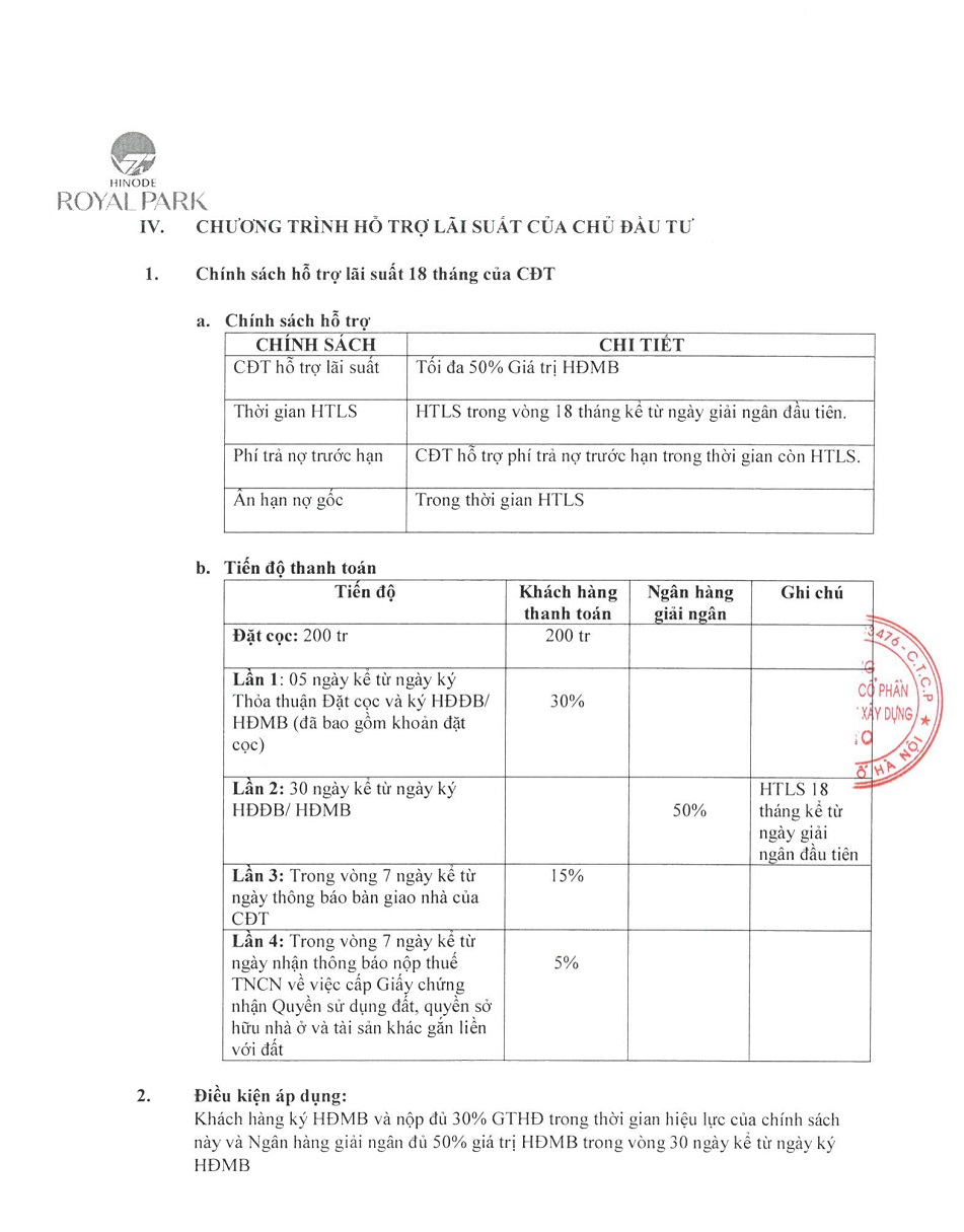 CHÍNH SÁCH BÁN HÀNG HINODE ROYAL PARK LK19-26-1. Ngày 2021.04.24