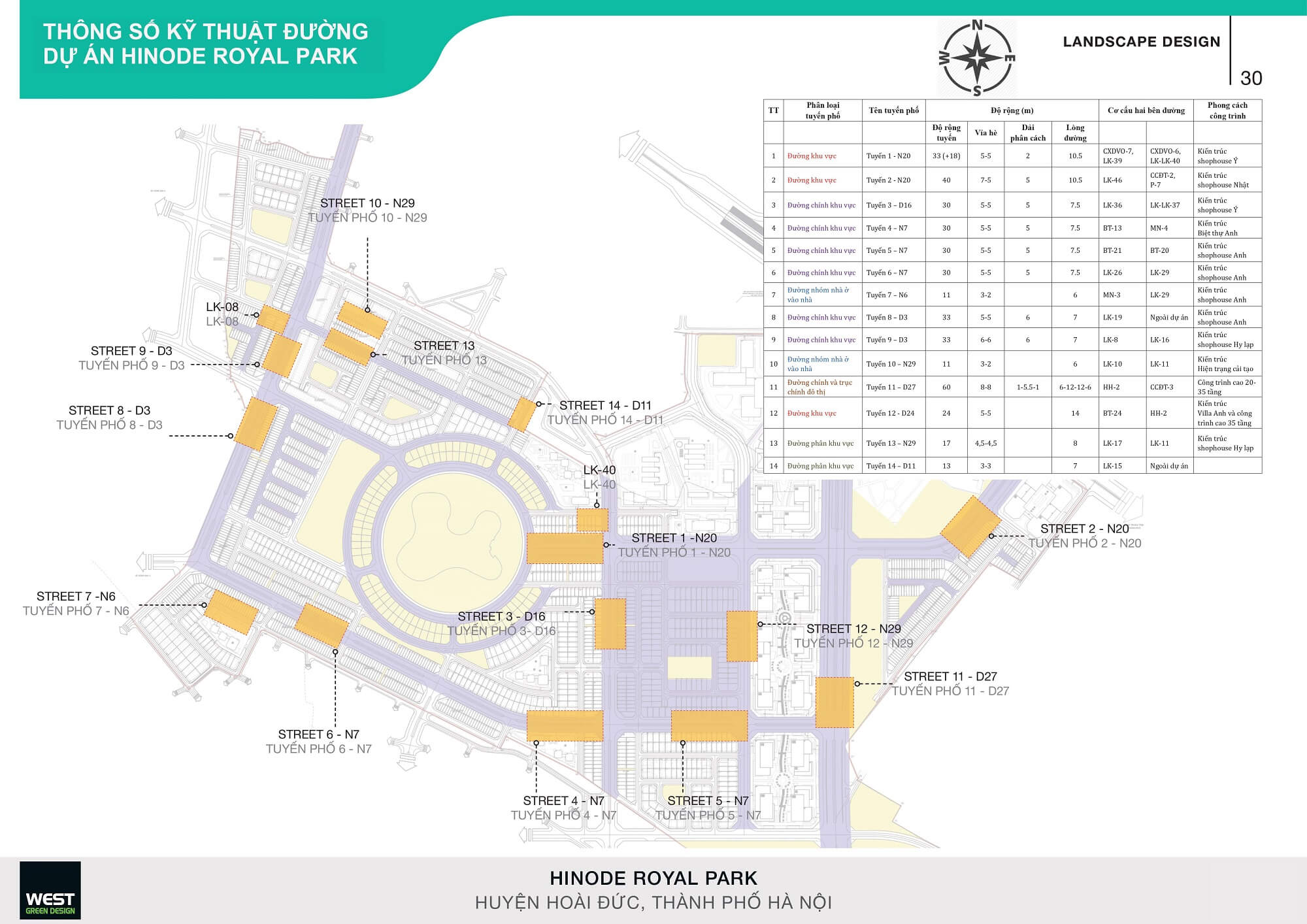 Độ rộng các con đường và thông số tại Hinode Royal Park Hoài Đức