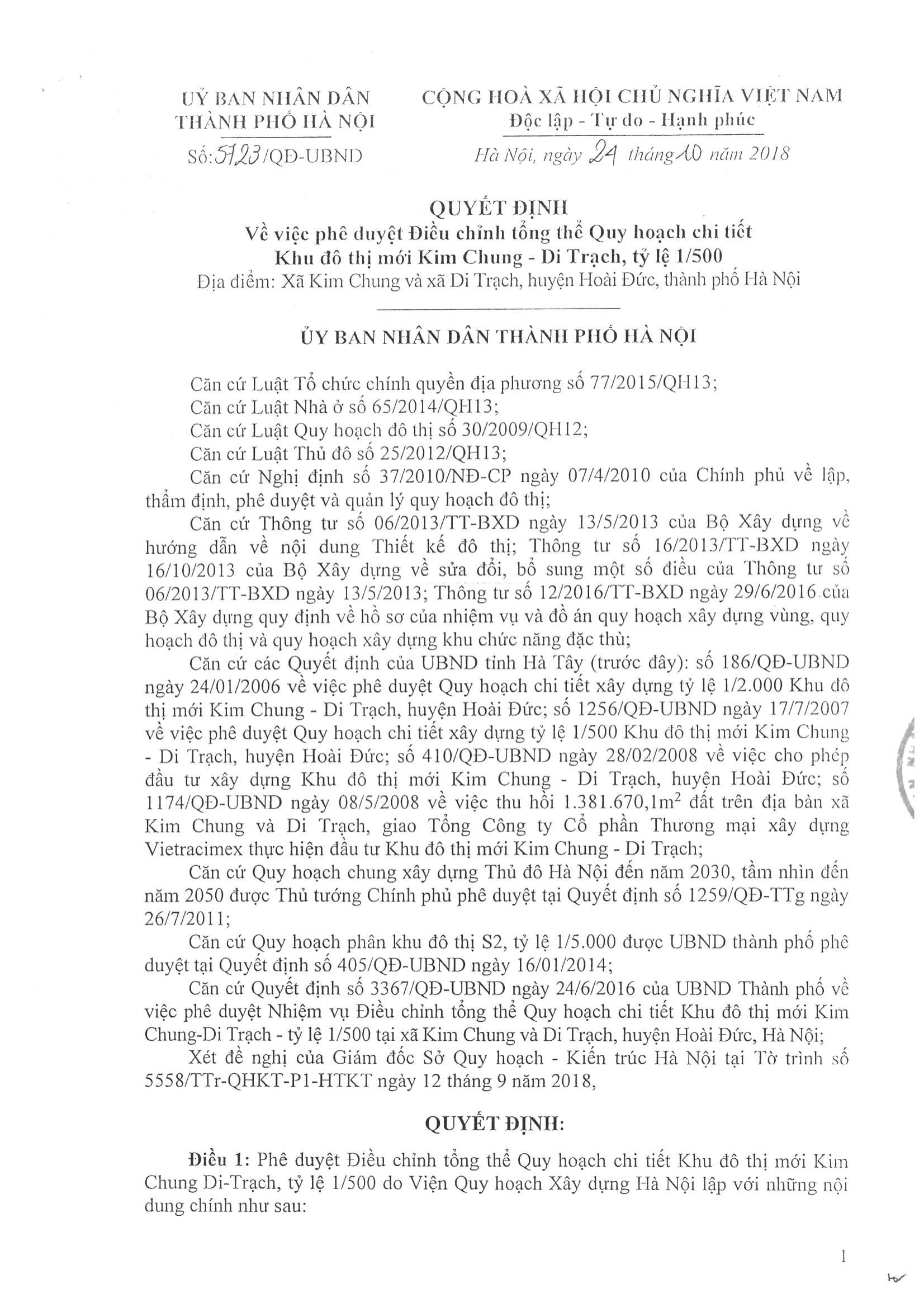 Phê duyệt Điều chỉnh tổng thể quy hoạch chi tiết KDT Kim chung Di Trach 1.500