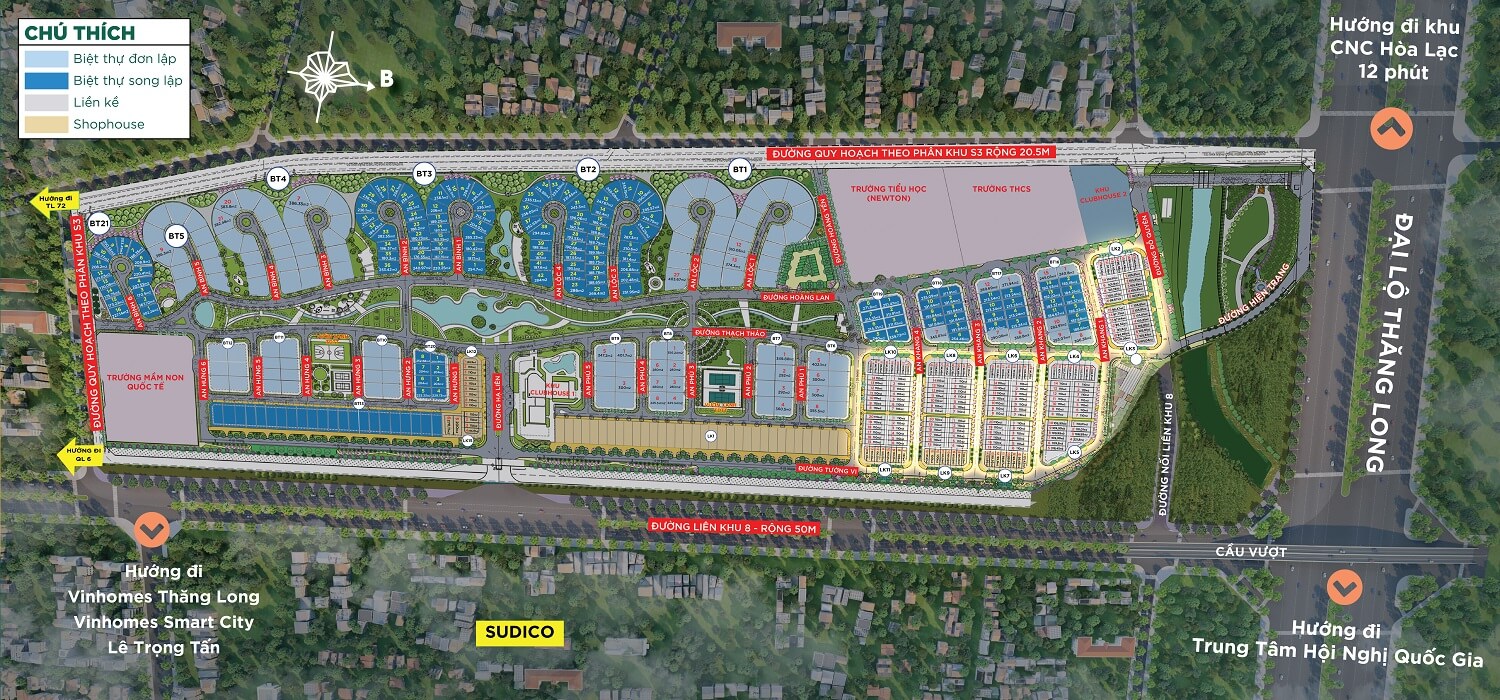 Đơn vị thứ nhất nằm ở phía Đông chủ yếu bố trí các nhà biệt thự song lập, nhà liền kề và nhà liền kề có vườn, nhà ở, lô phố. Đơn vị thứ hai nằm ở phía Tây, đây chính là trái tim của khu đô thị với một hồ lớn đặt ở trung tâm tạo cảnh quan cho các công trình xung quanh. Liền hồ nước là khu hỗn hợp thể thao, giải trí, ăn uống, thương mại, hành chính,… Ở khu vực này bố trí các biệt thự đơn lập, nhà vườn, nhà liền kề, nhà ở, lô phố, tận dụng tối đa cảnh quan mặt hồ và các công trình công cộng.